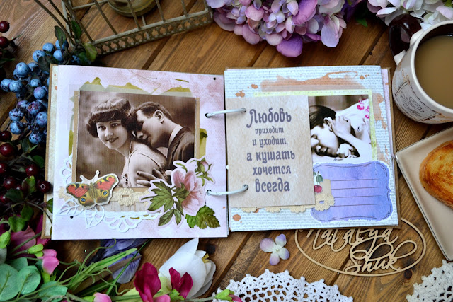 Альбом сложился буквально за два часа из бумаги и карточек коллекции Кулинарное искусство. На первый взгляд странный выбор, но если вдуматься и пофилософствовать, то любовь, как коронное блюдо, чем искуснее повар, его готовивший, тем великолепнее результат. Только вместо продуктов мы добавляем огромное количество старания, нежности, заботы, терпения и прощения.