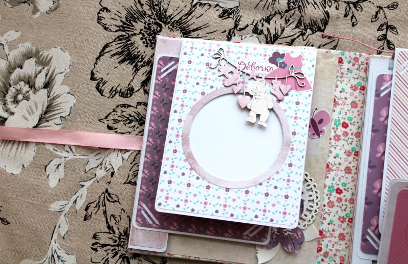 На первой страничке круглая рамочка с кармашком для фото